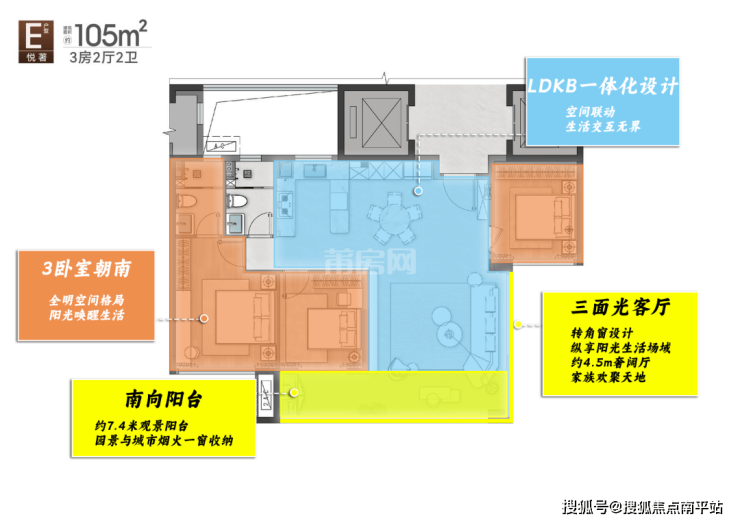 该户型虽然位于中间单元,但得益于项目的品字形分布和“L型270°采光”设计,该户型依然实现了三面光的采光和通风,不仅做到南北对流通风顺畅,还大大提升了屋内的采光面,在视觉上形成放大效果的同时,也提升了户内舒适度。