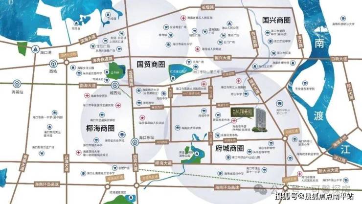 外部 “口” 字路网:椰海大道 / 琼州大道 / 红城湖路 / 龙昆南路,10 分钟到国兴 / 江东 / 海垦等商圈