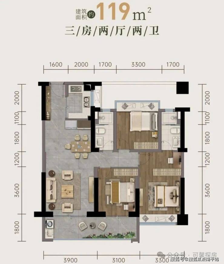 建面约119平 3房2卫👇