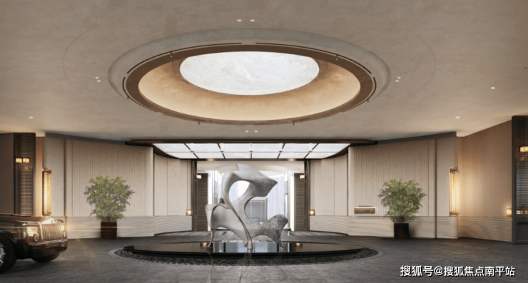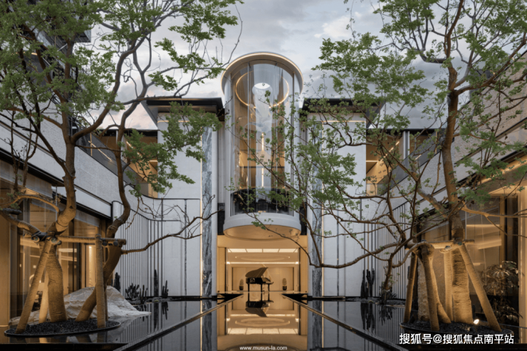 主入口以69米超尺度城市界面展开,融合7米高柱式挑檐,复刻奢华酒店落客环岛设计,营造仪式感的归家序章。归家路特选10米高丛生铁冬青“树王”作为迎归象征,结合三重奢石景墙与静谧镜面水景,构筑出充满领域感的城市界面。树木与水景相互映衬,天光与倒影交织成震撼视觉,在神性与光影的渗透中,形成引人入胜的精神场域,强化了归途中的仪式感与体验深度。围绕下沉庭院配备台球室、健身房、棋牌室、高尔夫、练歌房、私宴厅等功能,形成一体化的配套共享空间。