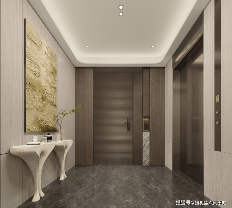 地上地下公区动线通过材质的精心搭配与空间比例的把握,营造出兼具仪式感与舒适度的归家体验。大堂整体以自然系为基调,地面选用大规格仿大理石瓷砖,配合精细水刀拼花设计,主背景墙由仿玉石超大岩板和木饰面屏风构成,形成丰富的视觉层次细节处理上,设计运用弧形元素提升空间艺术感,结合岩板拉槽、金属腰线,以及定制灯具灯带的结合,打造更具温度和仪式的归家路。不同材质的交叠,与空间体量呼应,让每一次归家都成为舒缓身心的开始。