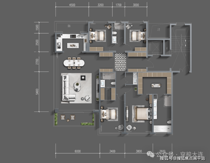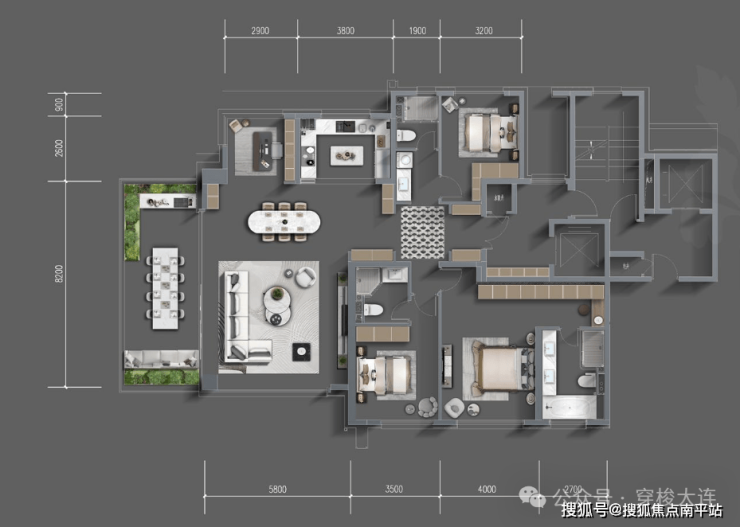 190平四室两厅三卫:小高17层,一梯一户,得房率约112%,南向四开间观海、约7m横厅、双主卧套房。