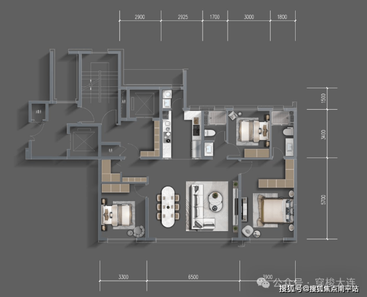 120平三室两厅两卫:小高17层,一梯一户,得房率约100%,一梯一户独立入户、多功能收纳系统、约6.5米宽厅。