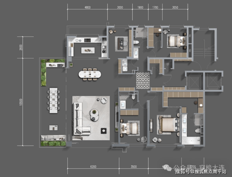 105平三室两厅两卫:小高17层,一梯两户,得房率约95%。主卧套房、独立餐厅、多功能收纳。