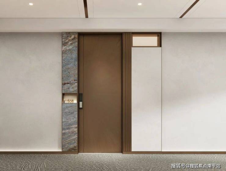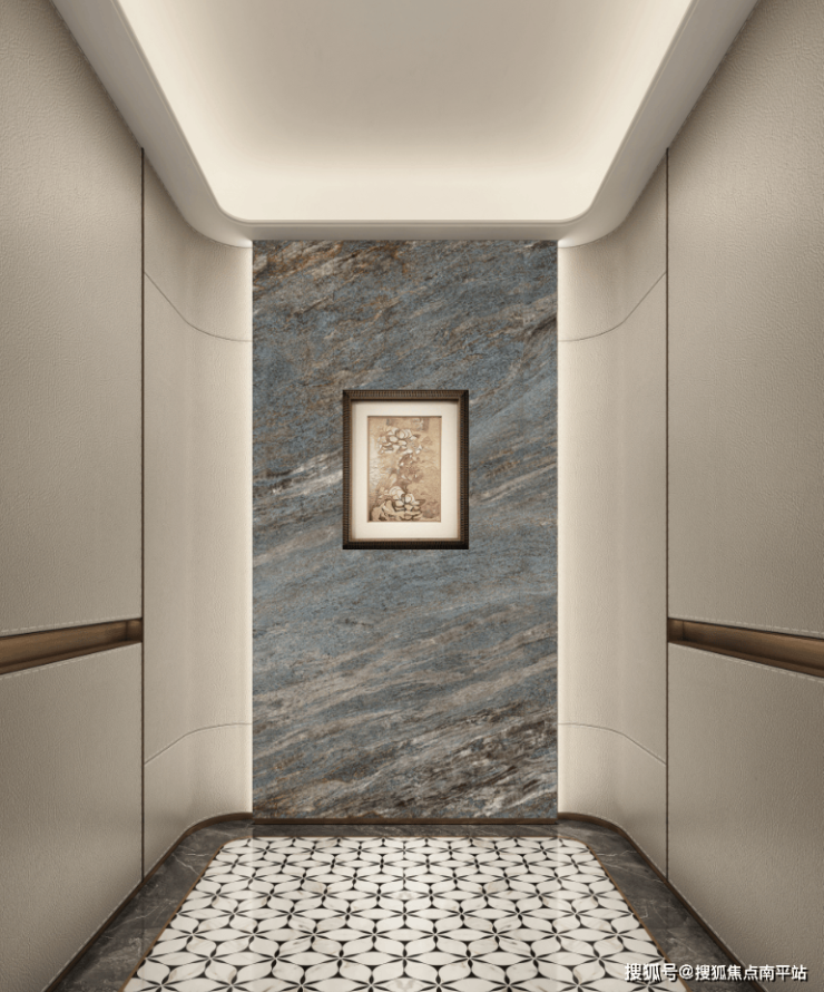 电梯厅的标准可参照今年交付的建发壹里:奢石+皮革铺装,奢华属性溢出。