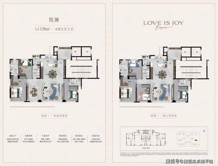 绿城悦海棠总共13栋住宅,4栋小高层+9栋高层,一共三个户型:128㎡、138㎡、172㎡,都是四房或五房,适合改善家庭。