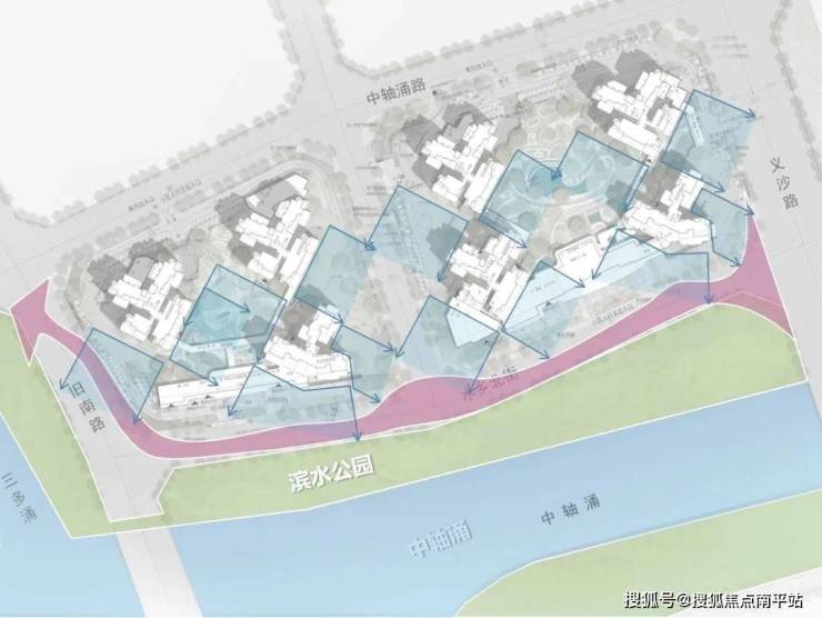 利用法线错开原则,消化建筑间距,保证最长直线一线河涌景观界面;同时结合用地条件及外部景观资源,通过角度偏转延伸视线,实现一线水景界面建筑观景角度最优。