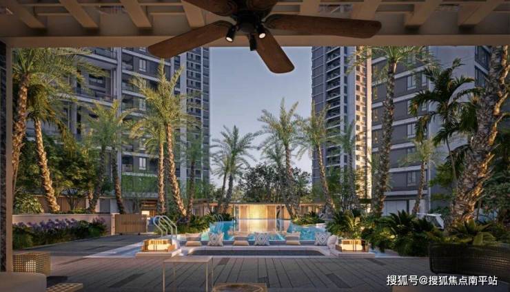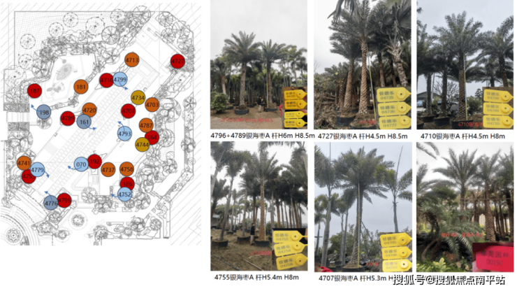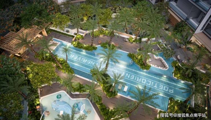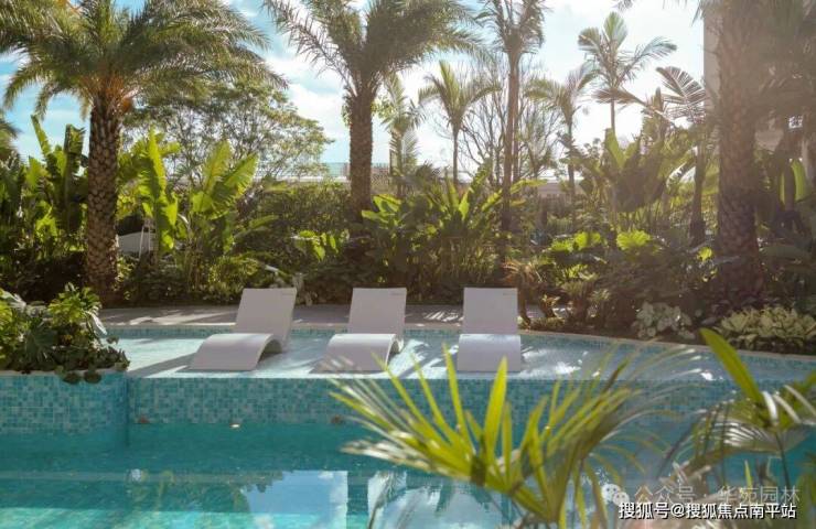 全季泳池空间作为场地中情绪最松弛、氛围最开放的界面,其呈现不仅关乎功能,更需承载生活中可供沉浸的惬意想象。为营造出轻盈、舒展的视觉感受,乔木选型以冠幅优美、主干多姿的树形为主,选用34株银海枣作为场地骨架,最高高度达9米。