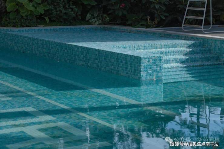 泳池本身选用蓝、白两色陶瓷马赛克混合铺贴,使光影在水底自然晕染,提升整体通透度与清爽氛围。泳池周边地面则使用星河灰干粒面通体仿石砖,以精细肌理衬托出轻度假、慢生活的空间语感。