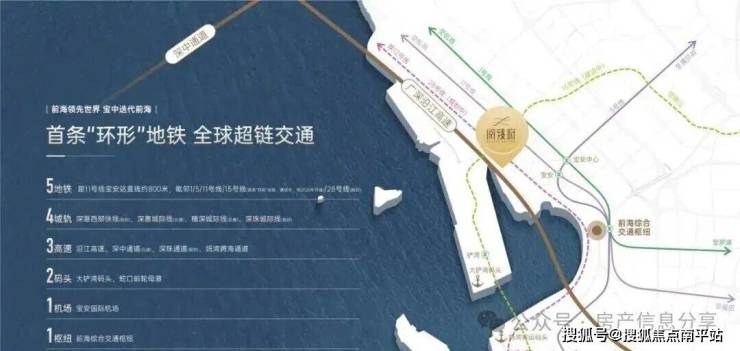 5地铁: 直线距离约800米11号线宝安站,邻近地铁1/5/11号线/28号线(规划)/15号线首条“环形”地铁(建设中)4城轨:深港西部快线 (规划) 、深惠城际线(在建)、穗深城际线(在建)、深珠城际线(已规划)3高速:沿江高速、深中通道(在建)、深珠通道(规划)、妈湾跨海通道2码头:大铲湾码头、妈湾客运码头1机场:宝安国际机场1枢纽:前海综合交通枢纽