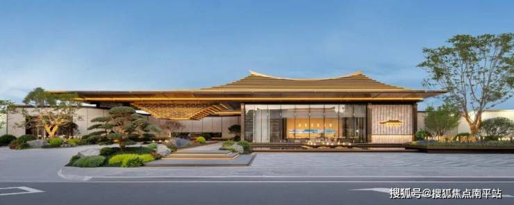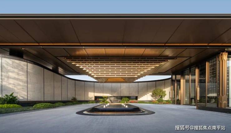 大门主入口引入“把酒店搬回家”的产品理念和“回家即度假”的生活理念,打造奢华酒店式归家大门。屋顶高约9.7米,整体挑檐向两侧延伸,长约49米,庑殿金顶的屋顶形态,以现代化的设计手法融入传统屋顶形式,结合鲁班锁倒影装置传达山水倒影的意境生活。