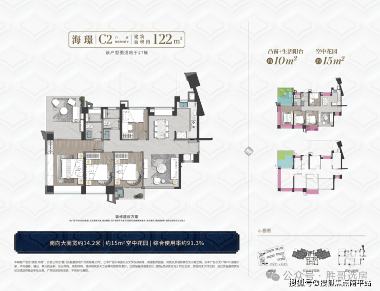 跟124㎡洋房一样,在北侧观海面设置了全赠送的景观空中花园,面积达到约8-16㎡,使得高层也实现了墅居梦想,凸窗及设备平台赠送约10㎡。