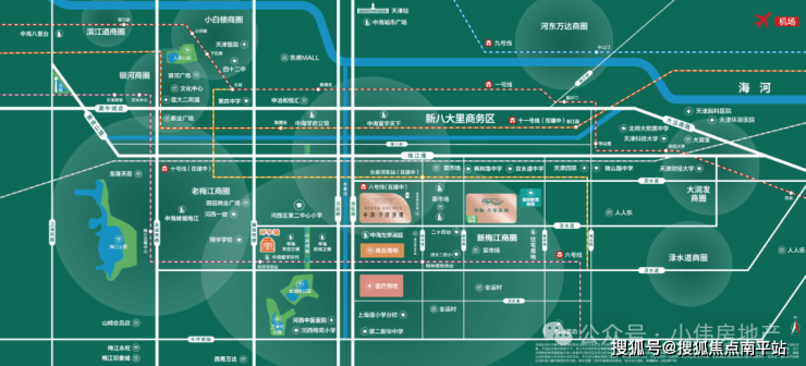 🟥医疗保驾护航:3公里范围内:南开大学附属医院、天津市第四医院、河西中医院;10公里范围内:天津市天津医科大学第二医院、天津医院、环湖医院、解放军464医院、肿瘤医院、海河医院6所三甲医院;1公里范围内:距离新梅江板块规划的三甲医院不足1000米,为家人健康保驾护航。