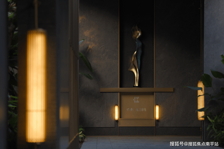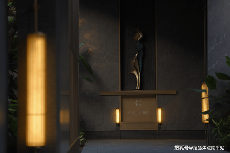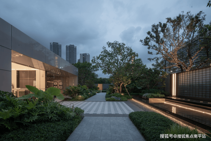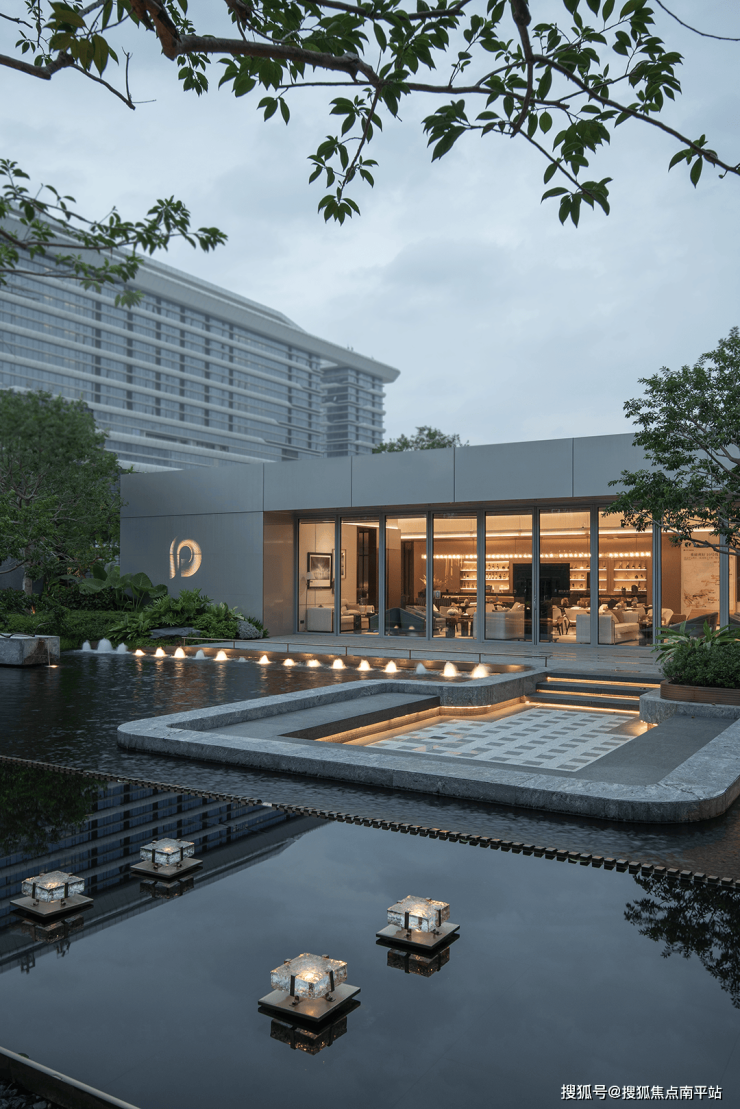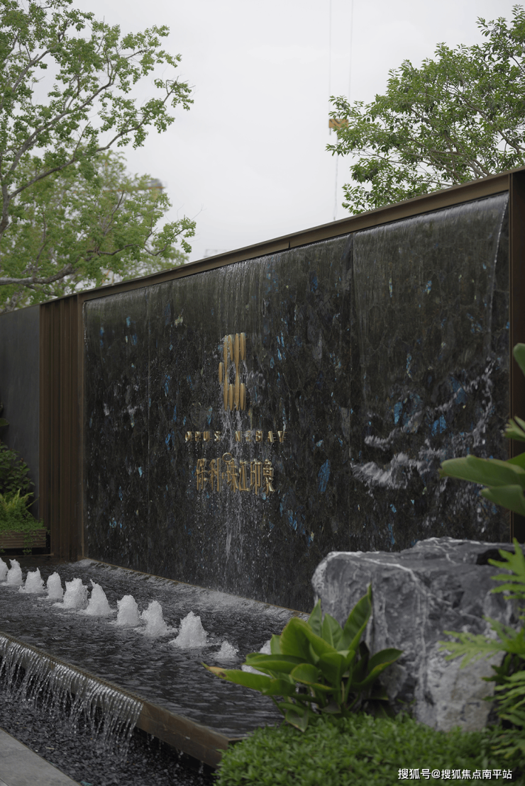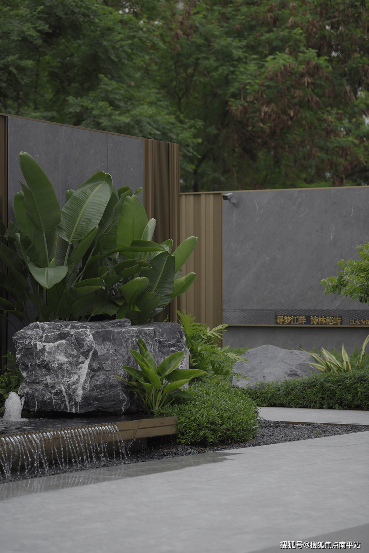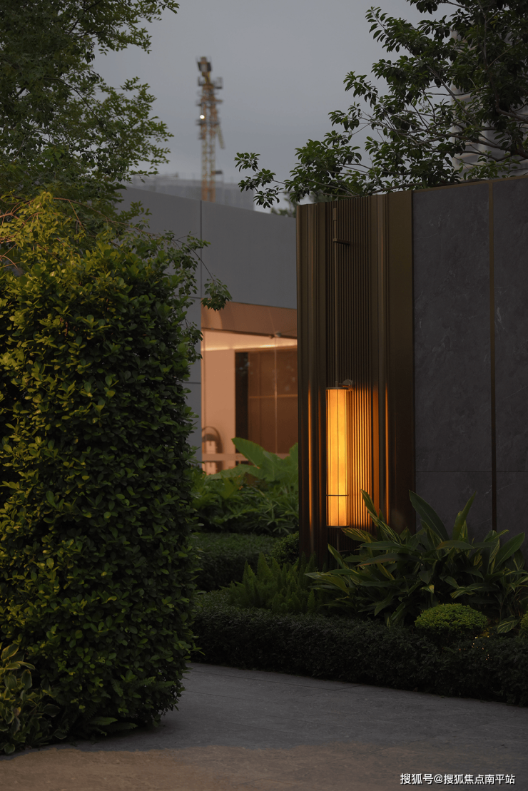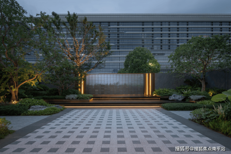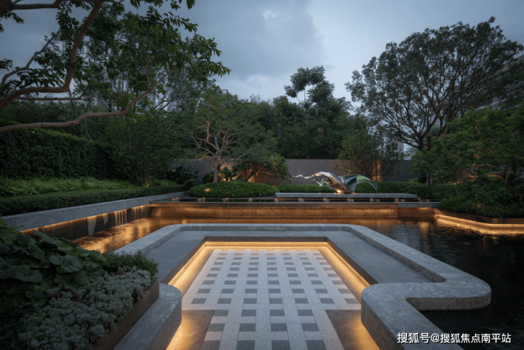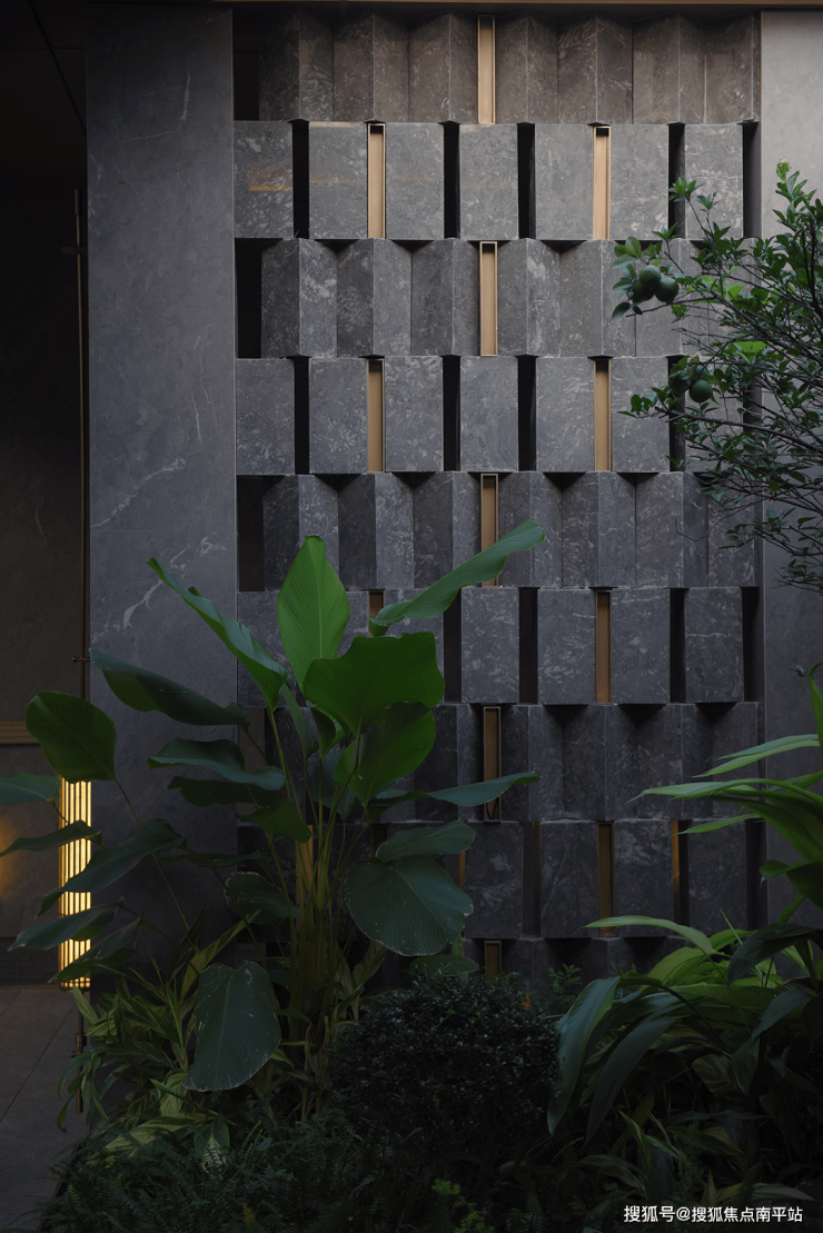 傍晚的灯光温柔洒落,既凸显了石材的沉稳质感,又让水流的动态更显鲜活,动静之间、虚实之中,整个空间散发着耐人寻味的魅力,引人驻足感受这份独特意境。