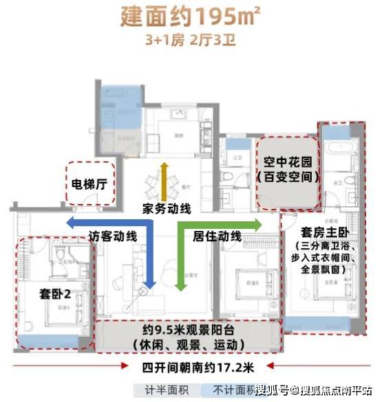 建面约195㎡的户型,为3+1房2厅3卫。四开间朝南,南向面宽做到了约17.2米,光客厅面宽就有约6.2米,长约9.5米观景阳台连接客厅,居家待客尺度都很舒适。