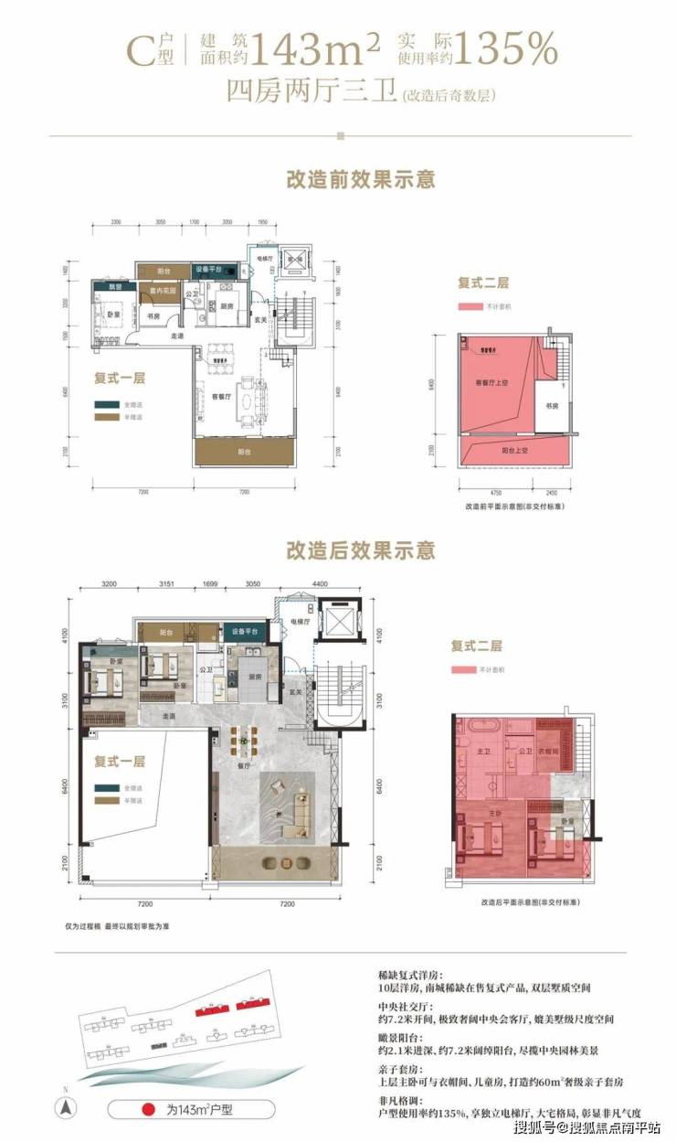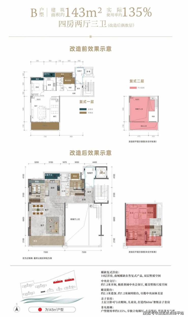 该户型,最大的亮点是得房率,套内使用率可达约135%,算上电梯厅接近140%,媲美200㎡大平层。重点是,买一层得两层,上下分层,媲美墅级生活!