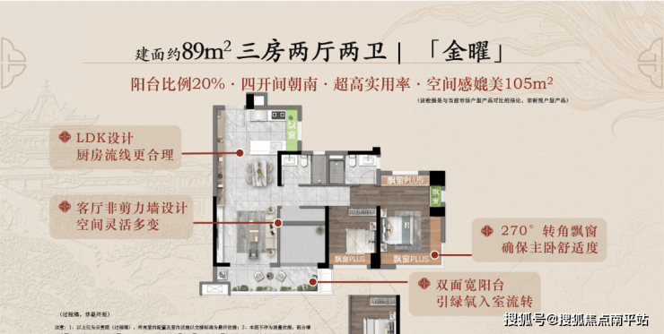 户型稀缺性:片区首个新规户型,使用率近100%,89㎡做三房两卫,总价门槛友好;