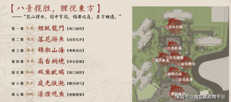 项目以“锦绣八景”为主题,融合岭南四大名园(梁园)造园精髓,打造“可行可望可游可居”的东方山水隐园: