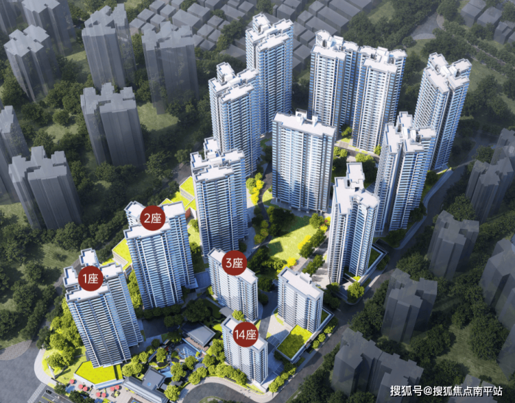 建筑布局:点状式排布保证每户景观与日照,全南向户型+开阔视野,俯瞰中心大园林;