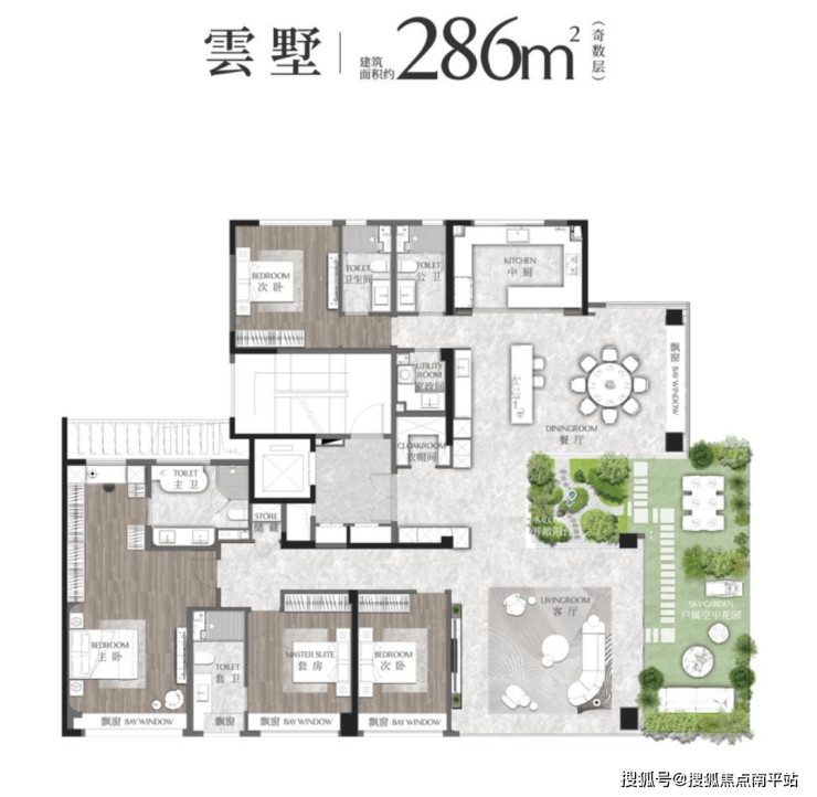 不少购房者喜欢这个户型,大概率就是看中了端厅+空中花园的搭配,约6米大开间的环幕厅设计,搭配巨幕落地窗,整体采光、视野极佳。