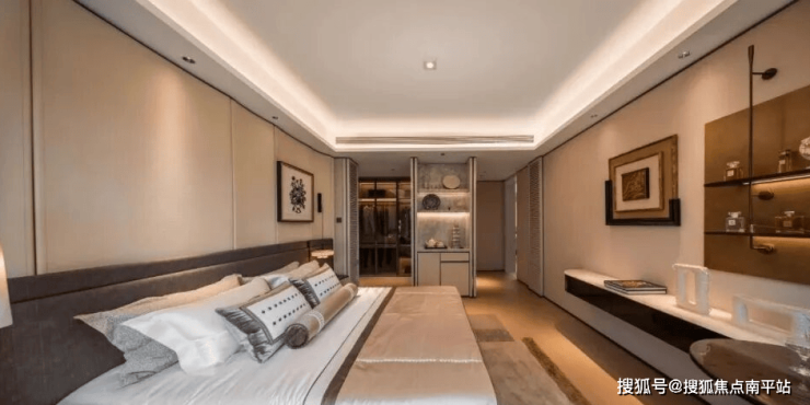 再来看南向双套房的设计,这大主卧面积约30平,超大步入式衣帽间,是众多女主人的最爱,搭配南向独立宽敞卫浴间,双盆洗手台+台面石材“安第斯雪景”,超大浴缸空间。
