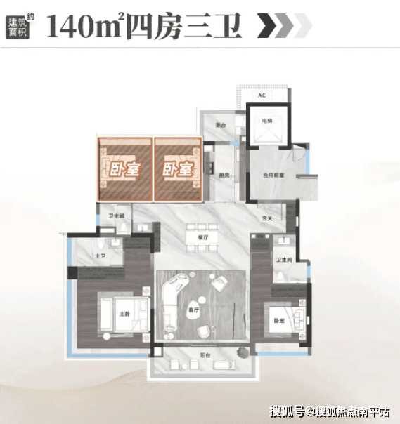 140㎡四房户型做到了私梯入户,“四叶草” 布局减少了空间浪费,南向面宽达 13.2 米,采光充足。客厅、厨房、阳台贯通形成约 40㎡的家庭社交区,主卧配备 270° 环幕观景窗,躺在床上就能看到湖景,适配科创精英家庭的需求。