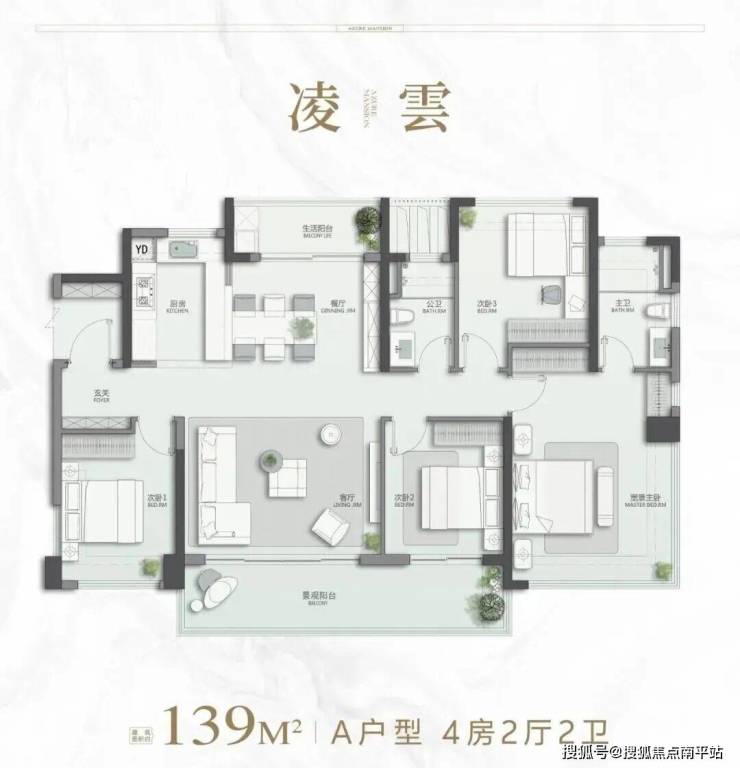 先来看看139㎡A户型。南北双阳台设计,四开间朝南,主阳台双开间约8米宽。