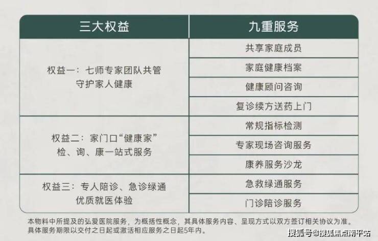 聚焦基础健康管理,为业主及家庭成员提供身份认证、家庭健康档案(含体检解读)、“七师团队”线上咨询及厦门市内送药上门;权益二主打家门口便捷服务,含定期常规指标检测、专家现场咨询与康养沙龙;权益三解决就医痛点,提供急诊绿通(急救专线链接弘爱绿色通道)及弘爱系医院每户每年1次免费门诊陪诊,全方位守护业主及家人健康