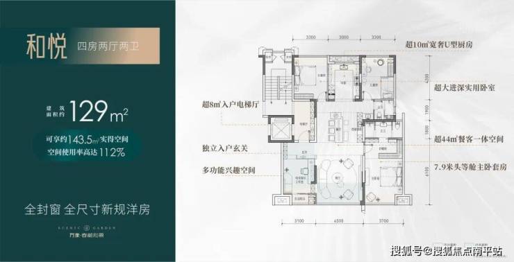 【四房两厅两卫】建筑面积约:129㎡;实得面积约:143.5㎡;实际得房率112%;,相当于旧规169㎡!(旧规户型按85%得房率计算,仅供参考)