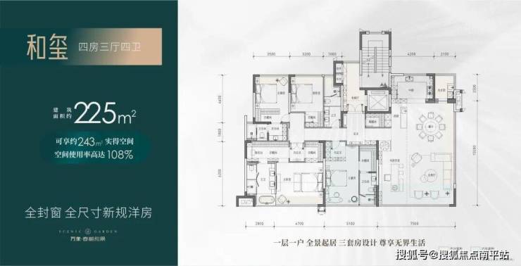 【四房两厅四卫】建筑面积约:225㎡;实得面积约:243㎡;实际得房率108%;相当于旧规286㎡!(旧规户型按85%得房率计算,仅供参考)