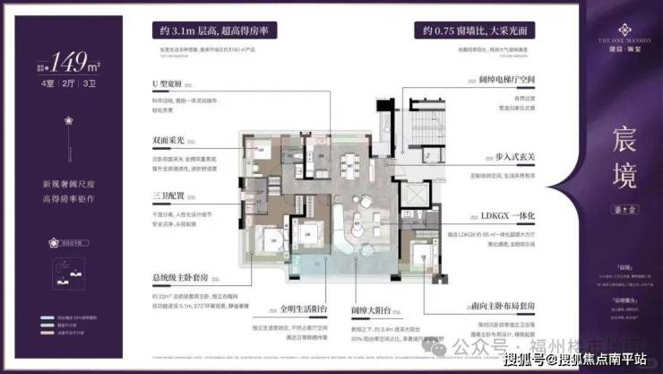 149平四房两厅三卫产品(106套):位于2、3号楼,楼高24-31层,层高3.1米,两梯两户,公摊24.1%;楼层差100-600元/平,备案区间价格3.19-3.60万/㎡,总价477-538万/套。