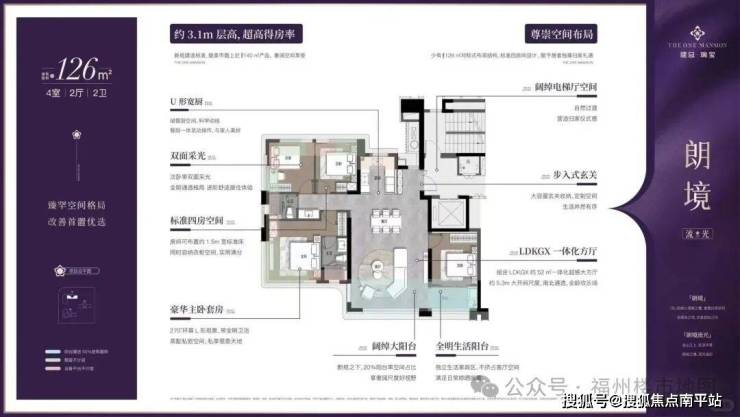 126平四房两厅两卫产品(60套):位于1号楼,楼高31层,层高3.1米,两梯两户,公摊27.9%;楼层差100-600元/平,备案区间价格3.0-3.37万/㎡,总价380-427万/套。