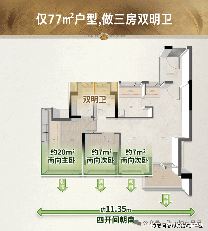约77㎡做到3空间2卫、约88㎡做到4空间2卫、约106㎡做到南北对流使用率高的88㎡做四房,此种高使用率户型,随着新规收紧便少见。