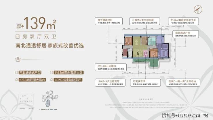 约32㎡南向套房主卧,搭配南向约3.9米大开间,“小家化”尺度与功能设计,从居住舒适度到功能性保障主人的从容起居;大四房的空间配置,可灵活满足三口之家、二孩家庭三代同堂等不同家庭结构和周期需求,真正达成“一步到位”的改善生活方式。
