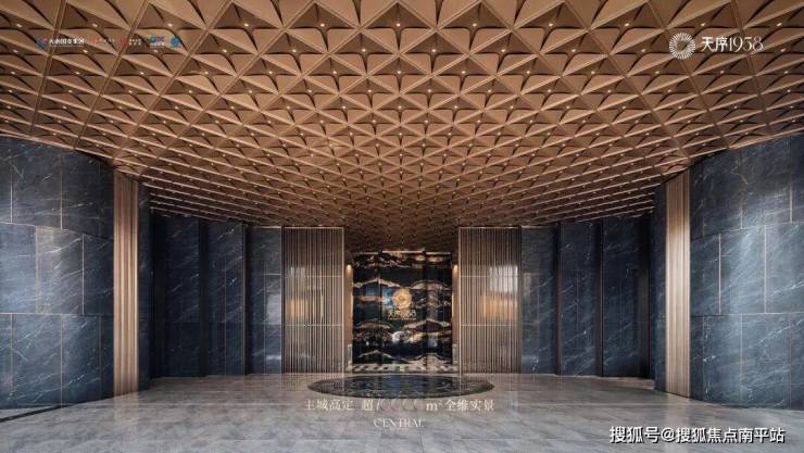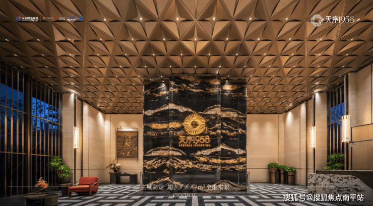 宽5米、高5.8米的宇宙金奢石矗立在6米挑高的大堂内,巴西进口、黑金相间,双面设计,与天序1958的LOGO相映成辉!