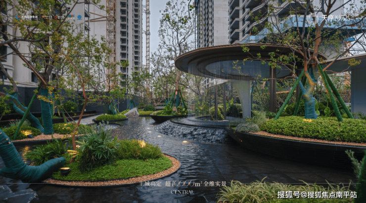 步入大门,映入眼帘的则是约140米的央景中轴实景展示,叠瀑镜水、云影回廊、城市浮岛、乌桕树阵...