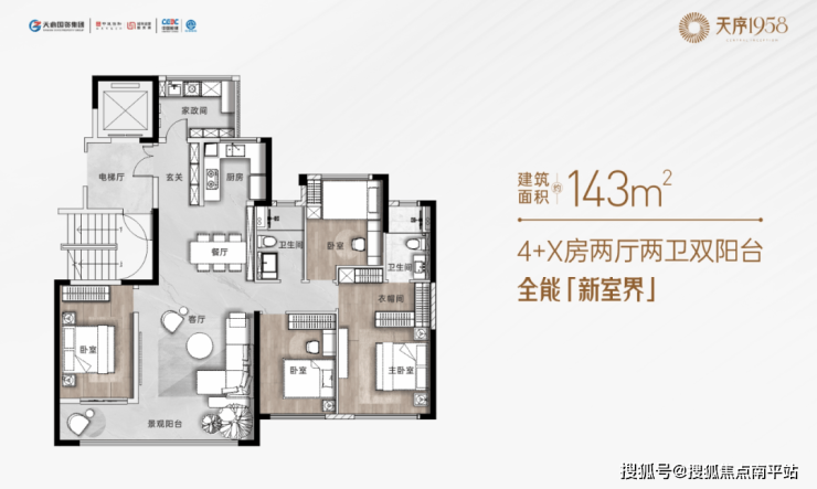 约14.3米的南向面宽、4开间朝南、约50㎡的一体化公共空间,4+X房的内部格局,既保证了尺度,又兼具功能性!