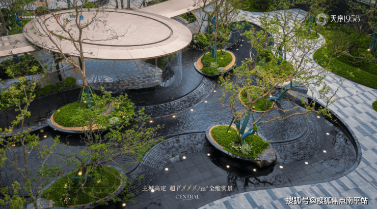 两极叠瀑水流与6组圆形的黑金沙树池相得益彰,每一级叠水有分为12小级,代表着12个月、12个生肖等。