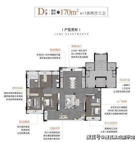 170㎡的洋房做了4+1房,南阳台面宽达到了约9.2米,3个卫生间,不过有一个暗卫。