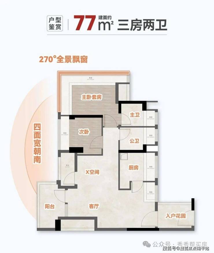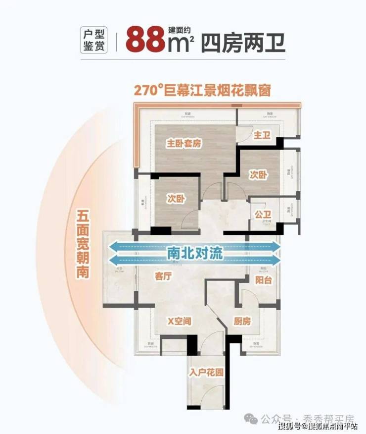 四开间朝南,客厅开间约3.3米,三个卧室南向,主卧270°全景飘窗,高区主卧甚至能望江。