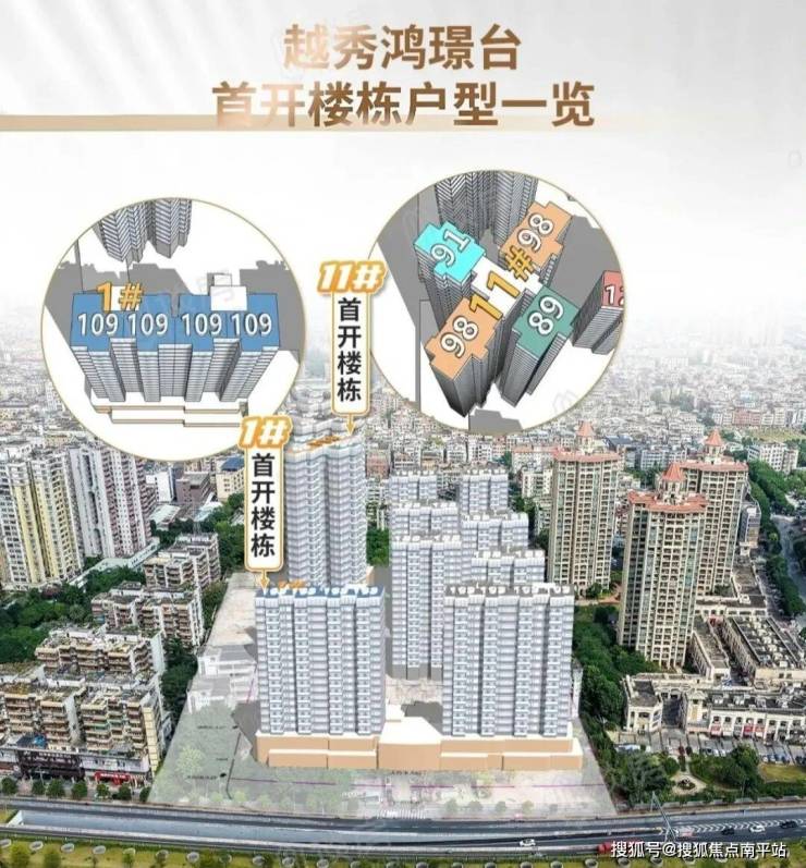 越秀鸿璟台,新中轴全新迭代产品,2T2板楼+2T4塔楼,主打建面89-122㎡三四房