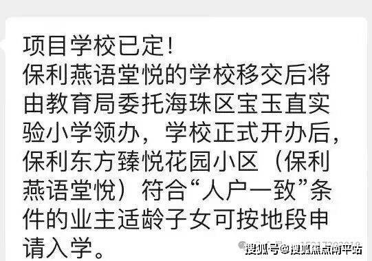 保利官宣了配建的24班小学,建好后将会移交将由教育局委托海珠区宝玉直实验小学领办,学校正式开办后,保利东方臻悦花园小区(保利燕语堂悅)符合“人户一致”条件的业主适龄子女可按地段申请入学。