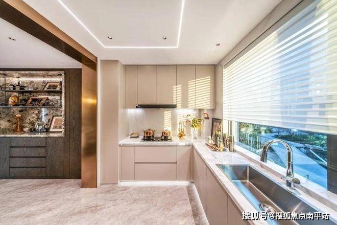 餐厅一侧贴心预留可改造空间,可打造成酒柜珍藏时光与品味。近10㎡半开放厨房,以流畅的L型布局,打造出仪式感十足的烹饪界面,让下厨也成为一场与家人互动的享受。