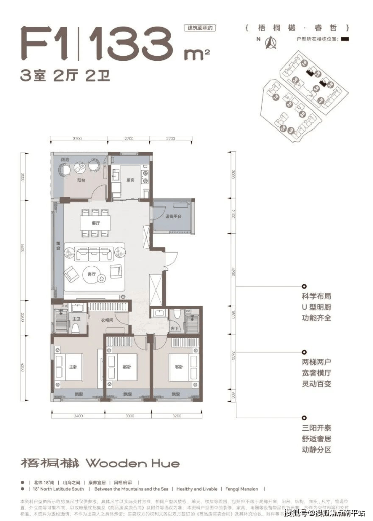 :科学布局,U 型明厨功能齐全。两梯两户设计,保障了业主的居住私密性。宽奢横厅灵动百变,搭配三阳开泰的飘窗设计,让室内采光充足,舒适奢居,动静分区合理,为业主打造一个安静、舒适的居住环境。