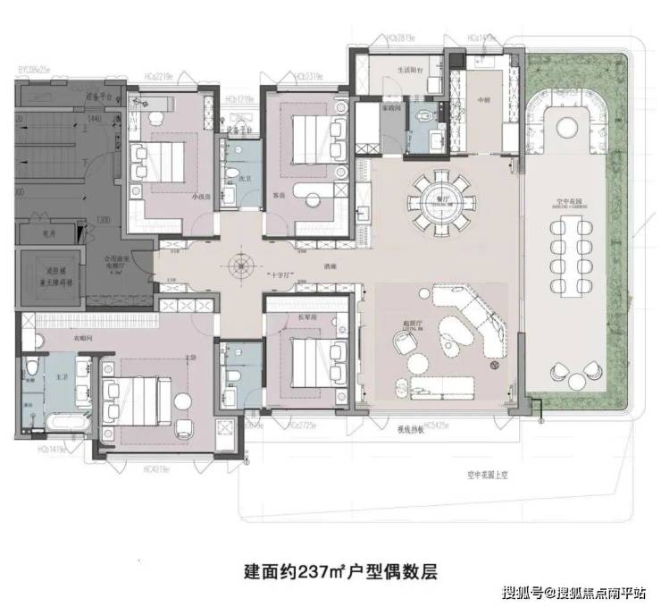 237㎡双洄游户型: 十字玄关串联四明卫+双家政系统,演绎顶豪生活仪式感