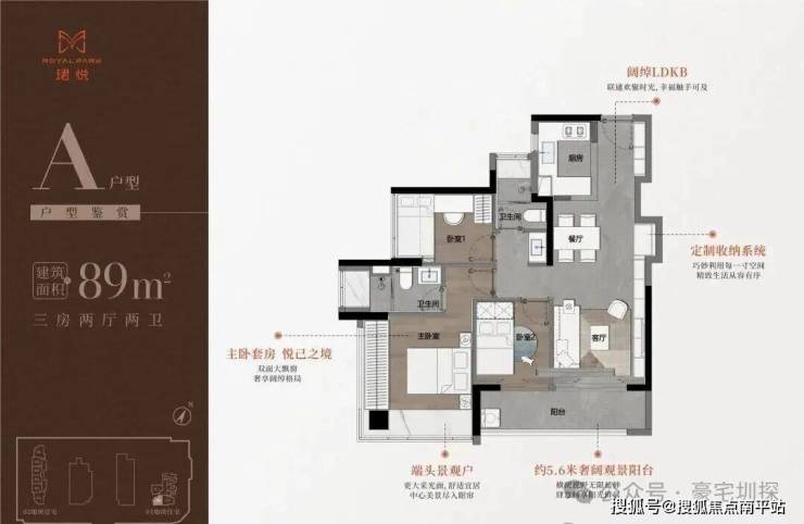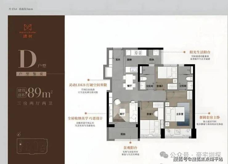 89㎡三房二卫A/B户型,位于1栋一单元,两开间阳台,主卧都有双面凸窗赠送。
