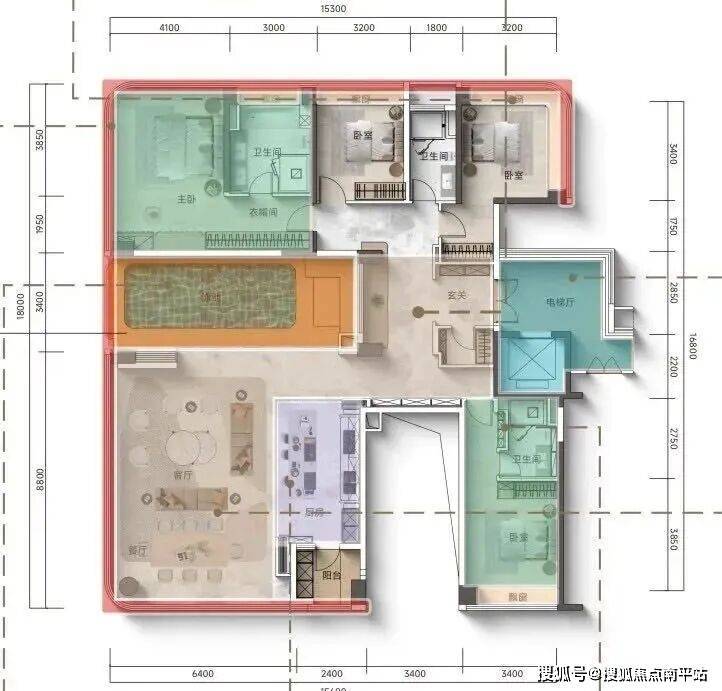 239㎡C户型,中西双厨,双套房设计,主卧空间约46.8㎡,最大亮点是带空中泳池或空中花园设计,挑高5米。