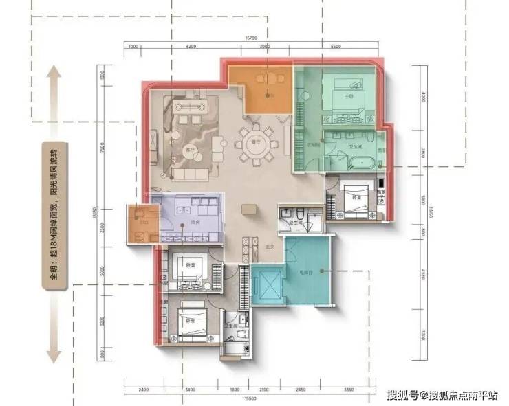 160㎡A2户型,该户型为东向景观阳台,最大卖点阳光充裕,三开间朝东,面宽约16.55米。