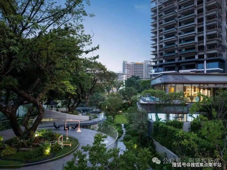 原址保留2棵原生古榕树,打造约2000㎡的月牙形榕树公园前厅。形成9000㎡内外双花园,隐于自然,归家即特权。