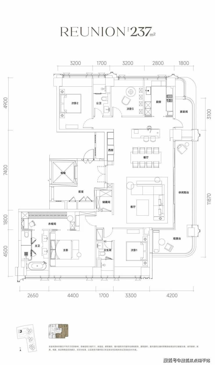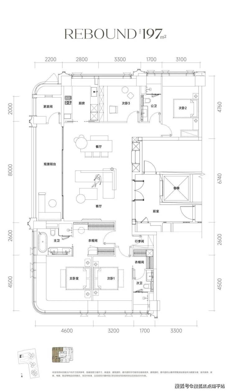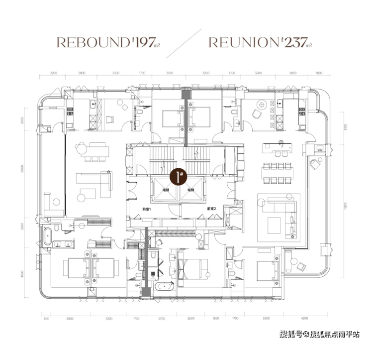 主力户型为197-235㎡大平层,主打T2/T3楼型。